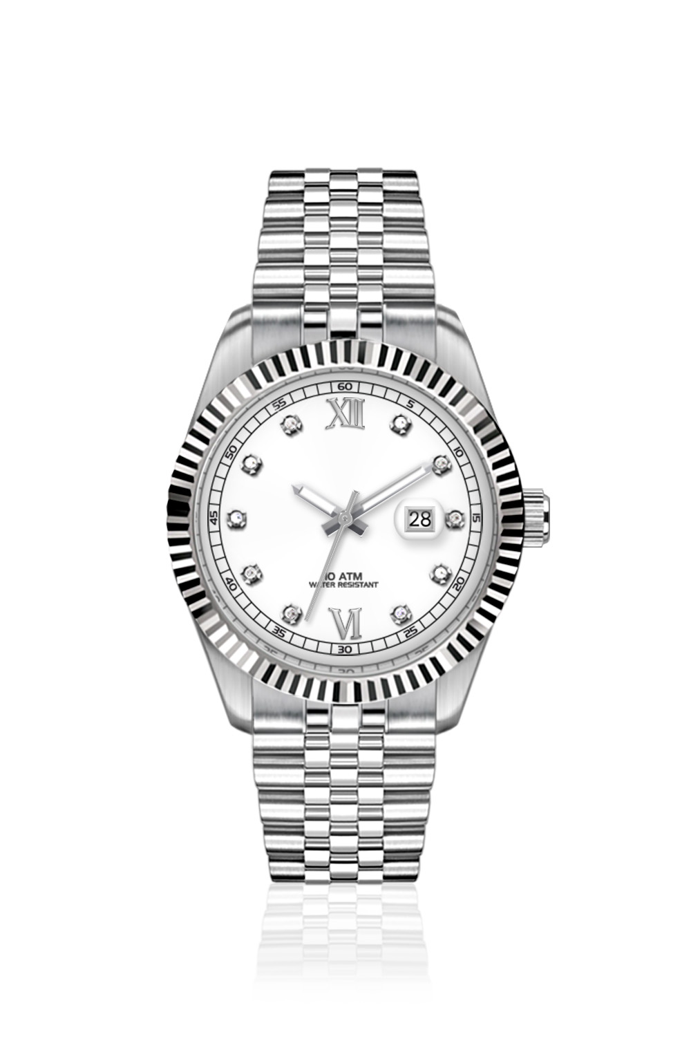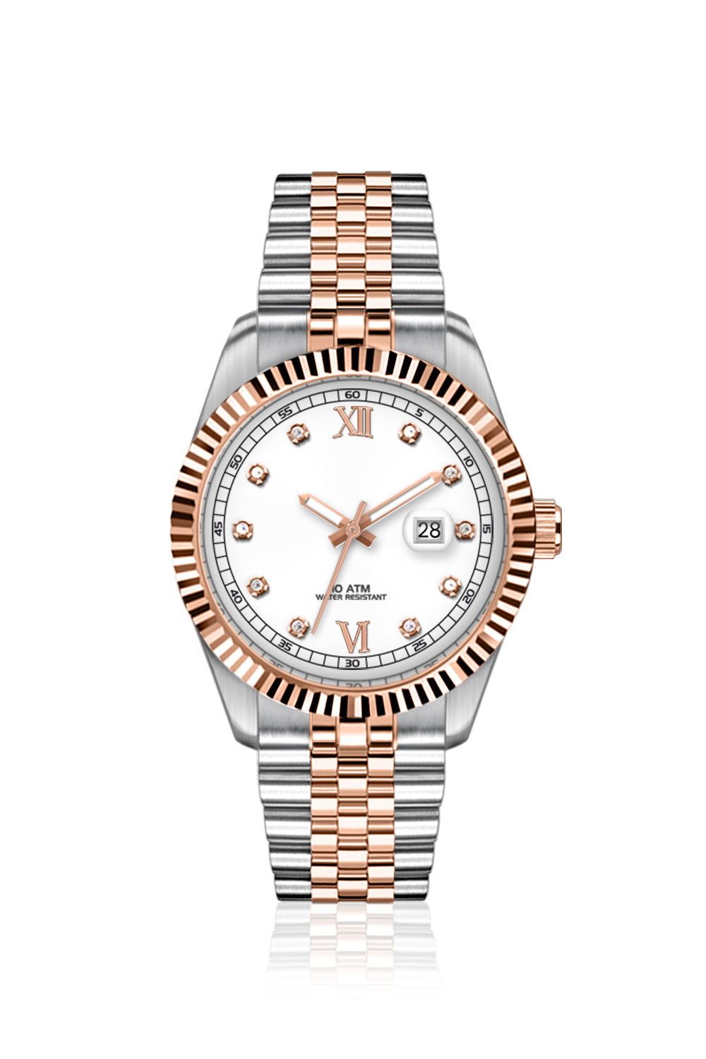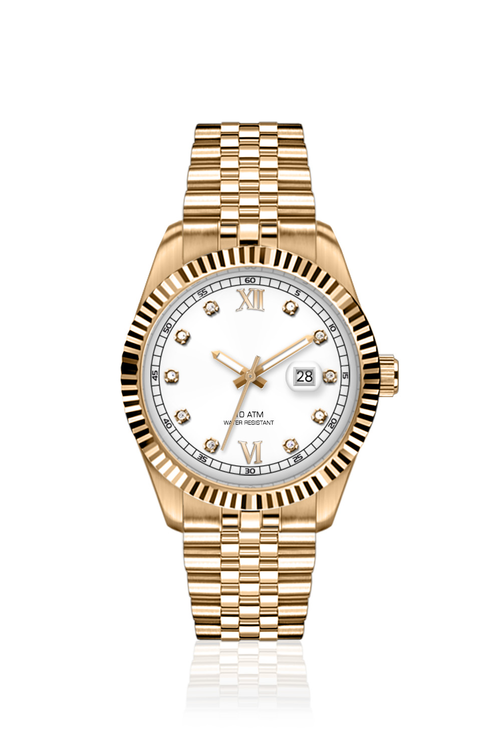 stainless steel Case - shiny / brushed / Gold Finishing - Diameter ø 31 mm - Case thickness 8 mm - mineral Glass - Dial opening ø 25 mm - shiny Dial with applied roman numbers and stones, printed minute track - stainless steel screw Crown - stainless steel screw Case Back - Movement 2015 Miyota - Functions hours, minutes, seconds, date - 16 mm stainless steel solid shiny / brushed Band - solid stainless steel butterfly Buckle - WaterResistant 10 ATM - Weight 71 gr.